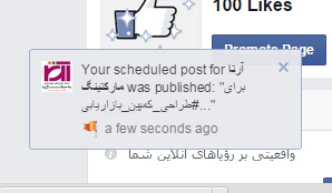 در همین بخش اگر از گزینه edit استفاده کنید، می توانید پست مورد نظر را ویرایش کنید. در نهایت بعد از انتشار پست توسط فیس بوک، نوتیفی مربوط به آن در سمت چپ و به صورت زیر نمایش داده می شود: