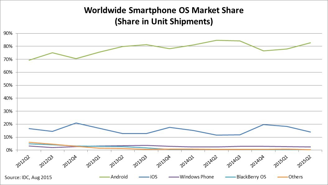 هم اکنون 82 درصد از کاربران کل دنیا، دارای گوشی ها و تبلت های اندرویدی هستند که البته نسبت به آمار سال پیش، تقریبا 2 درصد کاهش داشته است. در عین حال پلتفرم iOS نسبت به سال گذشته با 2 درصد پیشرفت، 13 درصد از کاربران را درگیر کرده است.