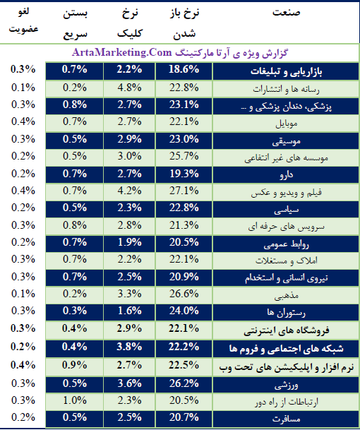 آمار مربوط به نرخ باز شدن و نرخ کلیک و لغو عضویت برای صنایع مختلف تا اوت 2015
