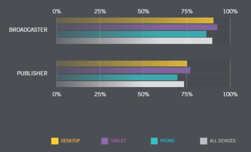 طبق این بررسی، نسبت به بررسی مشابه برای سه ماه اول 2015، می توان فهمید که تبلت ها نقش بیشتری در نمایش فیلم ها داشته اند. چرا که این آمار به 92 درصد رسیده است. ( 89 درصد از broadcaster ها و 77 درصد از publisher ها در سه ماهه اول به جهت مشاهده و اشتراک ویدیو، از تبلت استفاده کرده اند که این رقم در سه ماهه دوم افزایش داشته است )