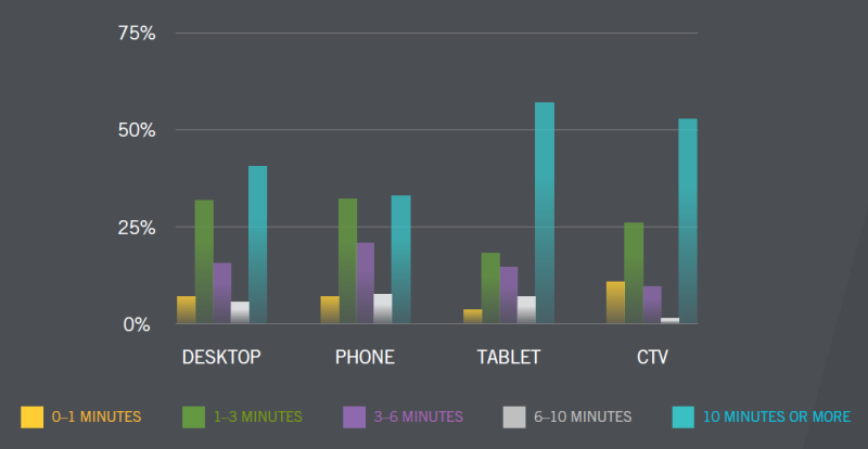 Ooyala به بررسی عمیق تری در این باره پرداخته است، بدین صورت که ، از میان کاربرانی که به تماشای فیلم به طور آنلاین پرداخته اند، 53 درصد از افرادی که از طریق تبلت فیلم دیده اند، 53 درصد از افرادی که از طریق TV متصل فیلم دیده اند و 40 درصد از کسانی که از طریق دسکتاپ به تماشای ویدیو پرداخته اند، علاقمند به دیدن فیلم هایی با طول 10 دقیقه یا بیشتر هستند.