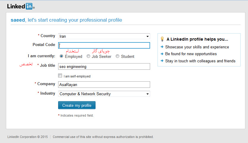 در این مرحله با توجه به مشخصات بالا، و بر اساس کاری که می خواهید انجام دهید، مشخصات خود را تکمیل کنید و روی دکمه ی آبی رنگ با عنوان Create my Profile کلیک کنید.