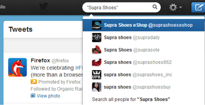 توییتر دارای یک جستجوگر real time است، که شما هر چه را در آن جستجو کنید، فعالیت های زنده در همان زمان در مورد، کلمه ی مورد جستجویتان را به شما نمایش می دهد.به عنوان مثال اگر در کادر جستجو در عبارت supera shoes بنویسید، در همان موقع، اطلاعاتی از افرادی که این عبارت را در نوشته های خود منشن کرده اند، به شما نمایش می دهد. شما می توانید یکی از این نتایج را انتخاب کنید و شروع به ایجاد ارتباط با وی نمایید.