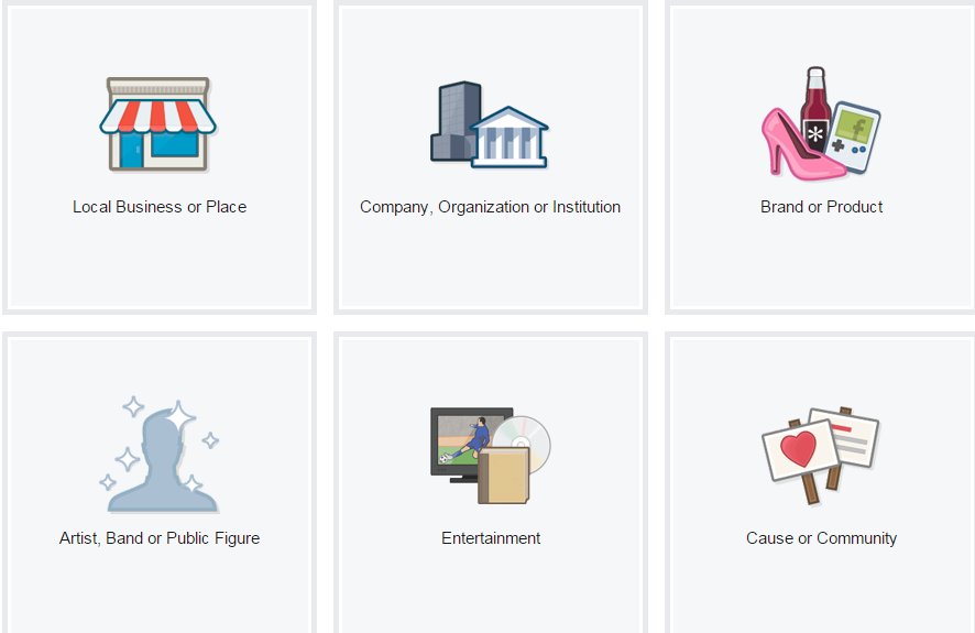 بعد از این مرحله، فیس بوک به شما امکان ساخت صفحه به منظور خاص ارائه می دهد. شما 6 پلن روبروی خود می بینید که بر اساس موضوعیت صفحه ی خود باید تنها یک مورد را انتخاب کنید: