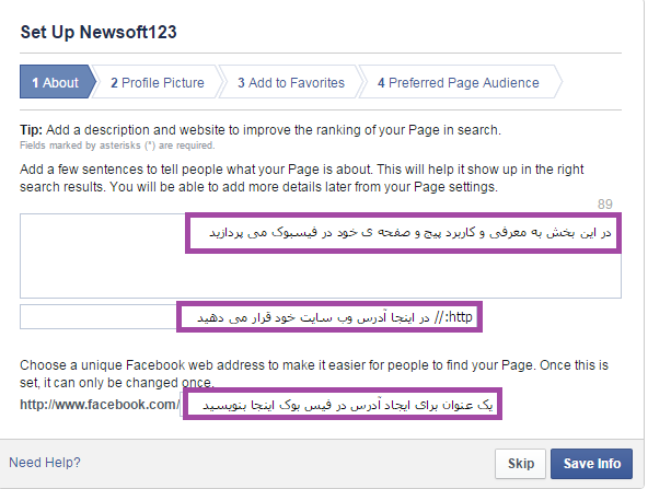 در این تب باید توضیحاتی در مورد صفحه، سایت و آدرس صفحه وارد کنید :